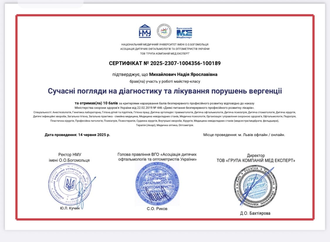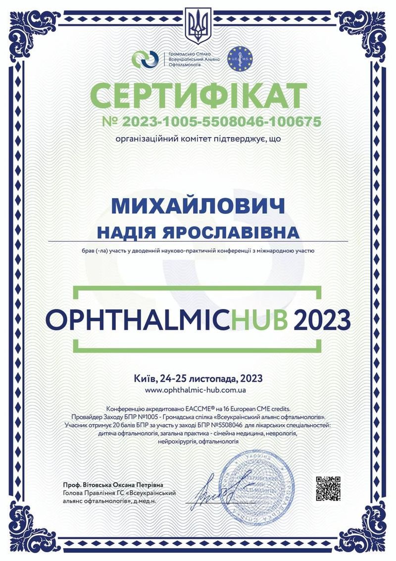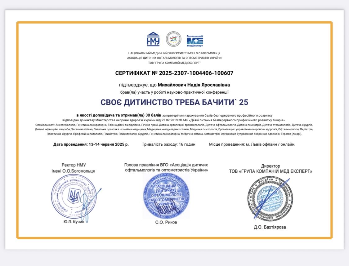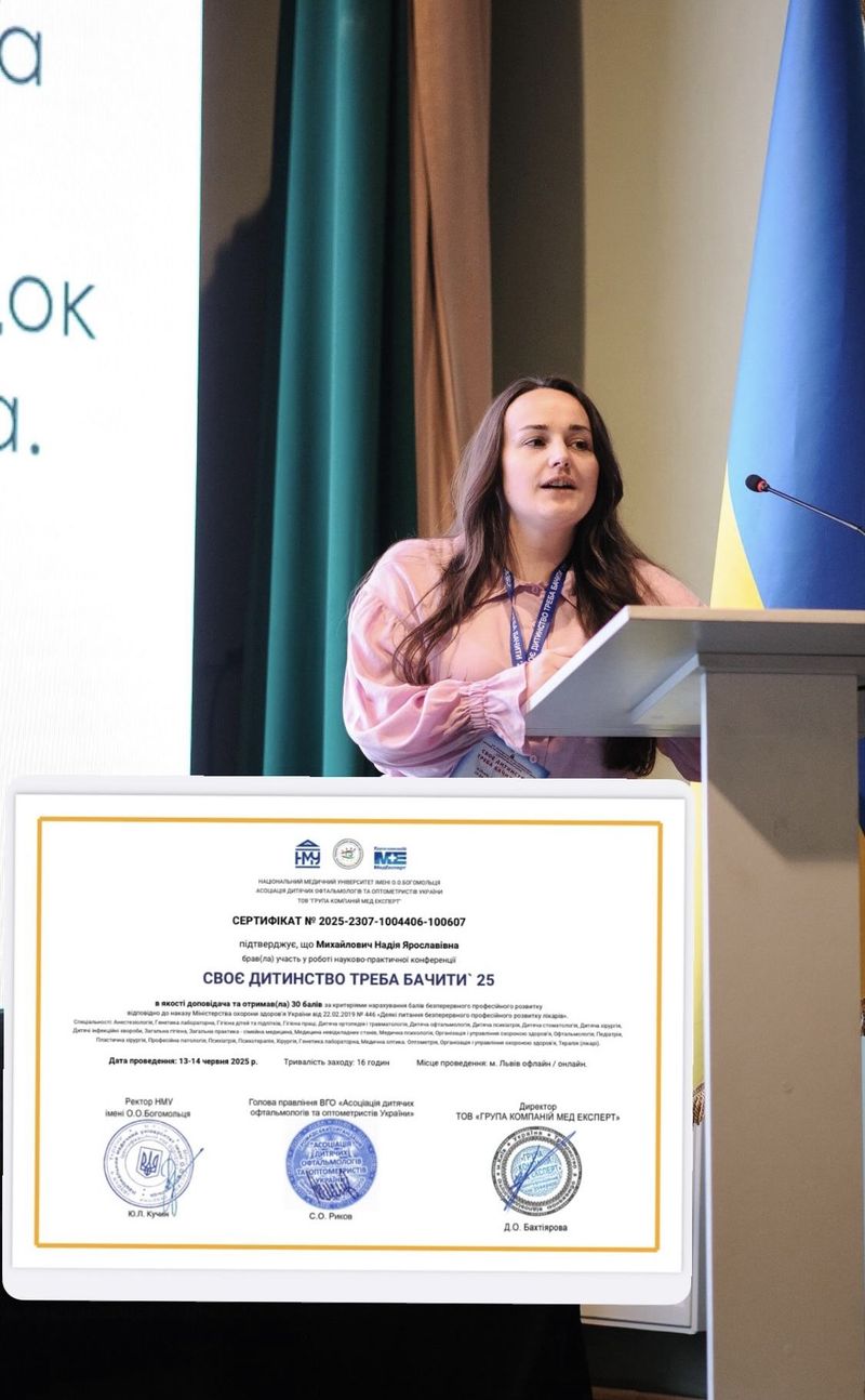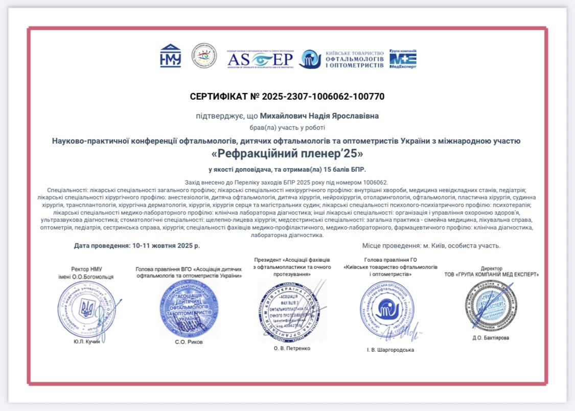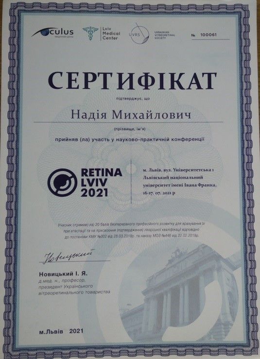 2. атестувалась при Івано-Франківському медичному університеті за спеціальністю Офтальмологія.
