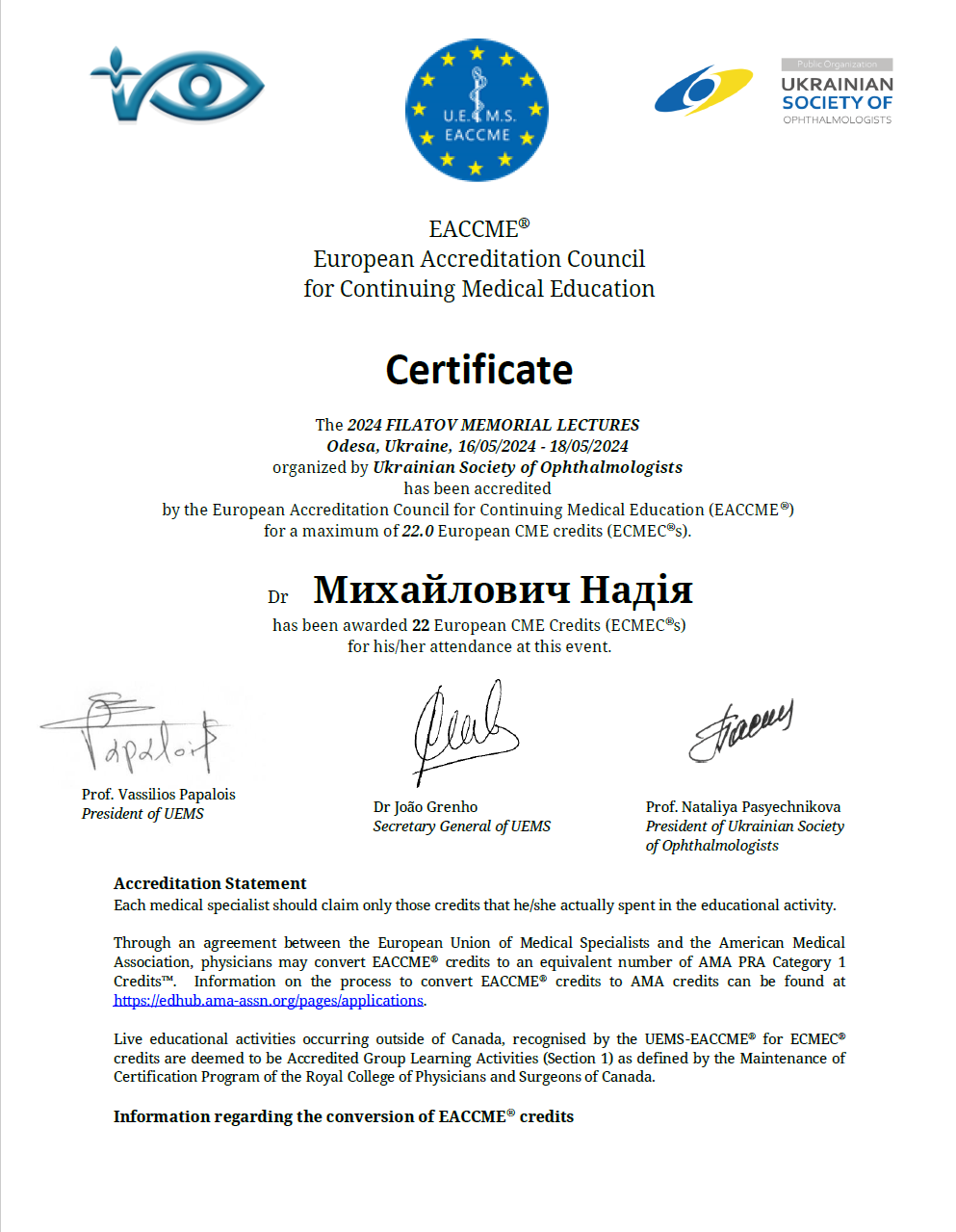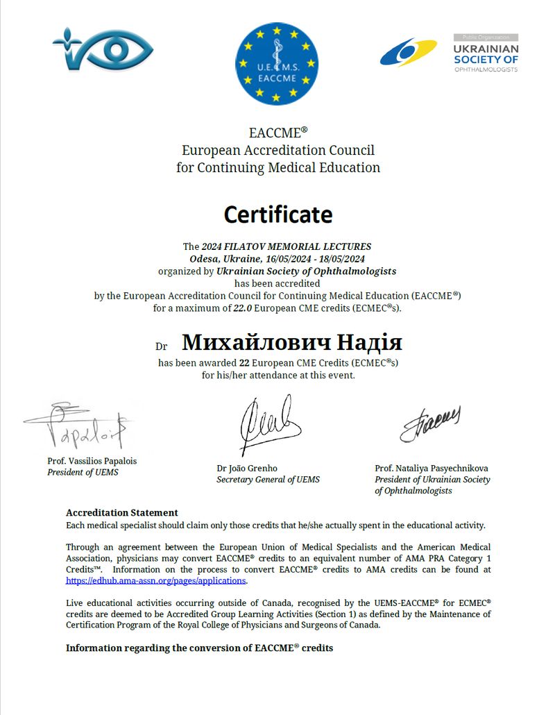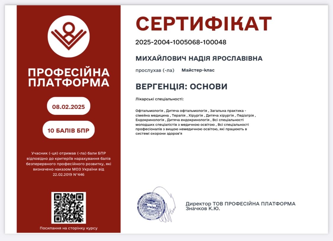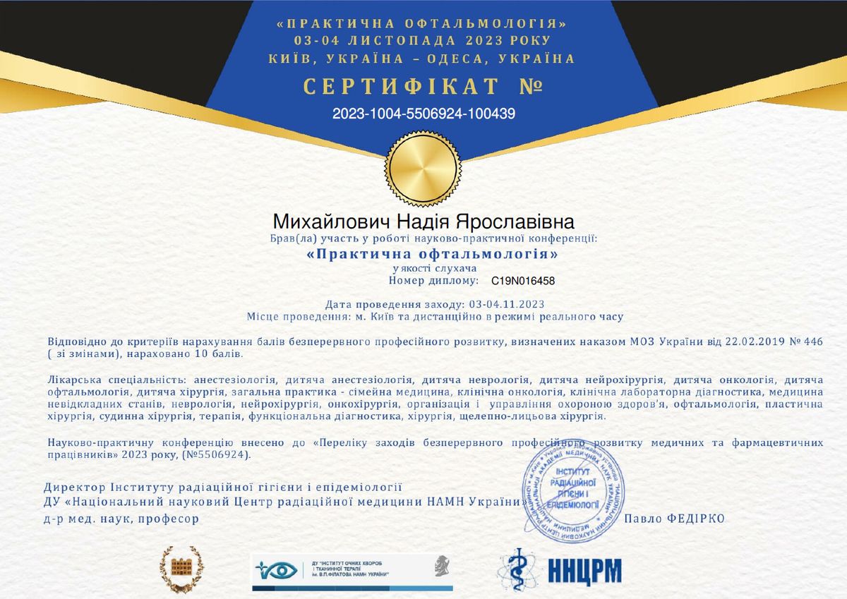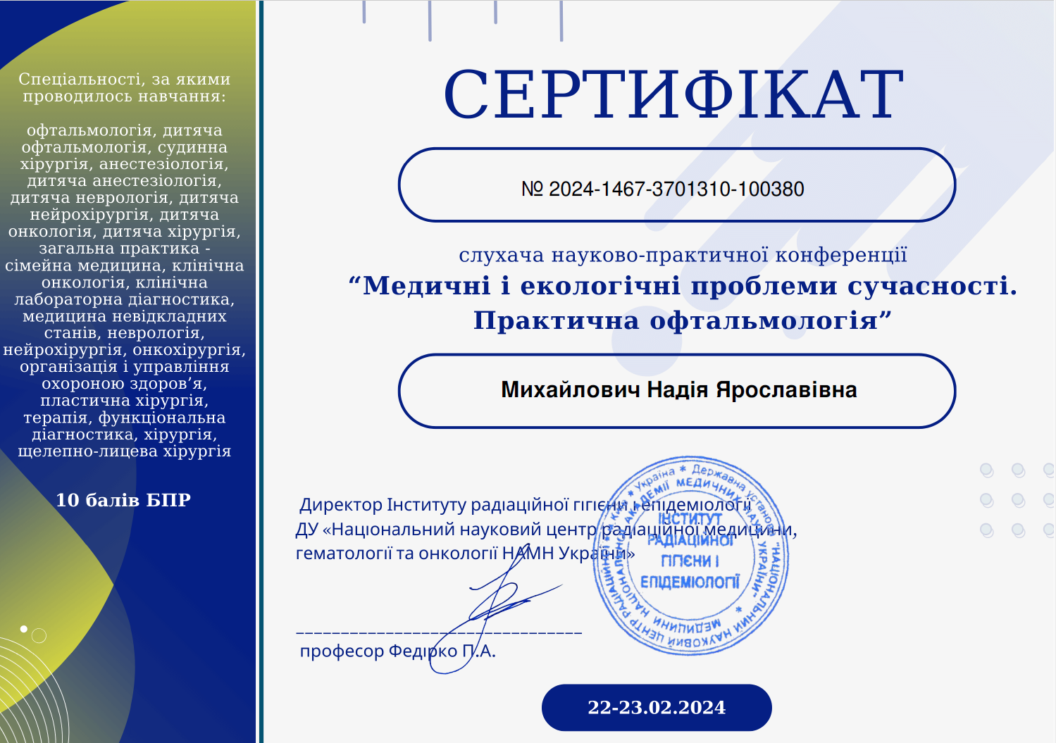 2. атестувалась при Івано-Франківському медичному університеті за спеціальністю Офтальмологія.