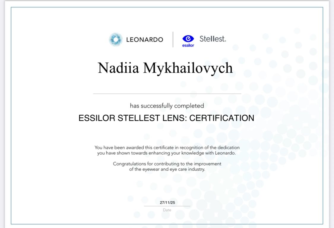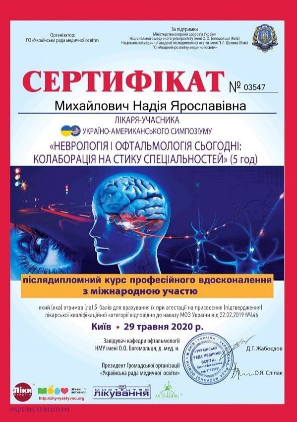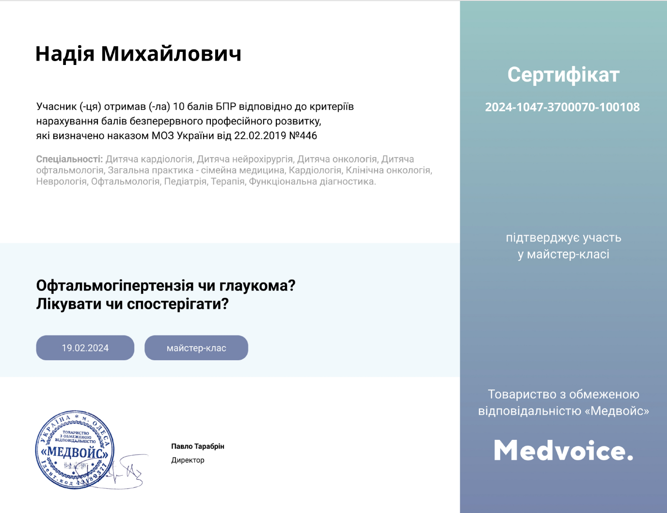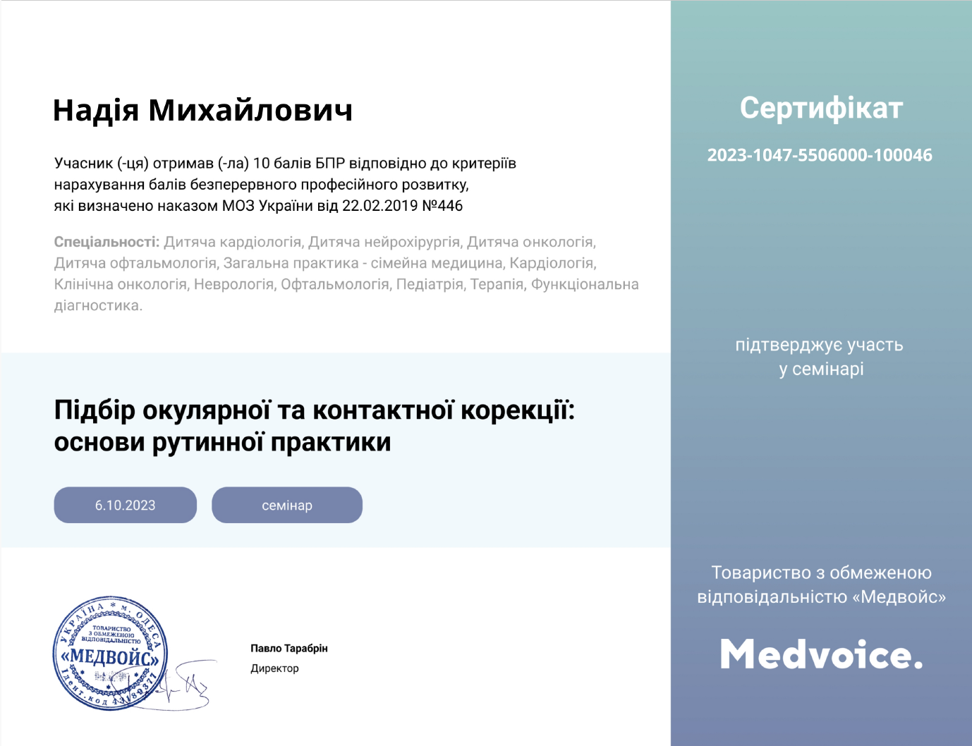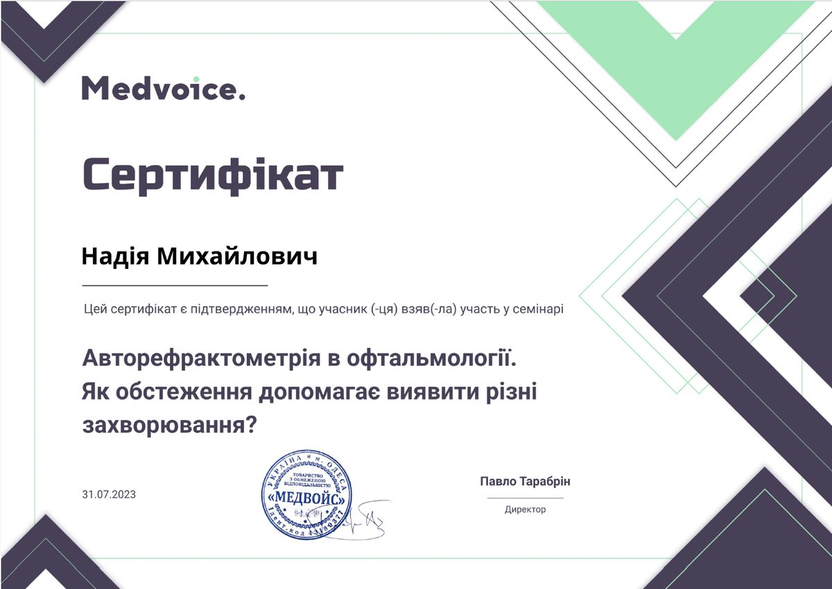 2. атестувалась при Івано-Франківському медичному університеті за спеціальністю Офтальмологія.